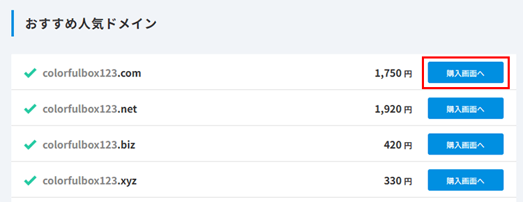 ご希望のドメイン名の「購入画面へ」をクリックします。
